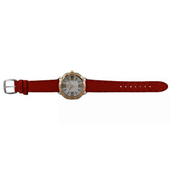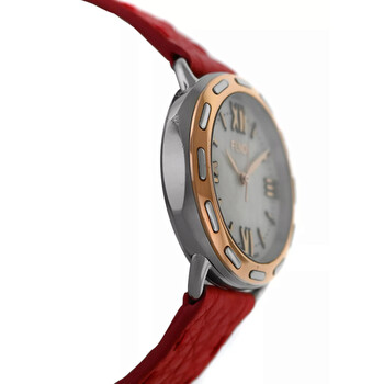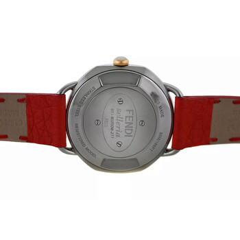 Silver-tone stainless steel case with a red leather strap. Fixed rose gold-tone stainless steel bezel. White dial with rose gold-tone hands and Roman numeral & index hour markers. Minute markers around the outer rim. Dial Type: Analog. Quartz movement. Solid case back. Round case shape, case size: 36 mm. Buckle clasp. Water resistant at 50 meters / 165 feet. Functions: hour, minute, second. Selleria Series. Luxury watch style. Watch label: Swiss Made. Fendi Selleria Quartz White Dial Ladies Watch F8302345H0.