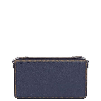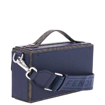 Fendi Men's Crossbody. SKU: 7VA565-AQWH-F1O8P. Color: Dark Blue/Tbmr/P. Size: H: 13 cm × D: 6.5 cm × W: 21 cm. Fendi Soft Trunk Baguette Leather Crossbody Bag. This crossbody bag features full-grain leather panels layered with FF canvas, with a flap and magnetic FF clasp, a lined interior, a leather pocket with six cardholder slots, and palladium-finish metalware. The strap, made of tech fabric and featuring logo lettering, is adjustable and detachable. 100% calf leather, 96% viscose, 4% acrylic. Made in Italy.