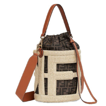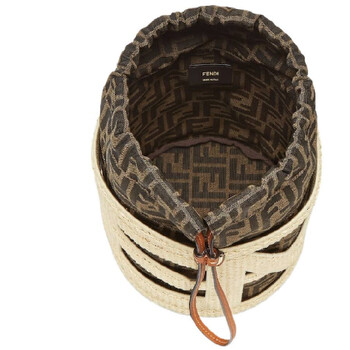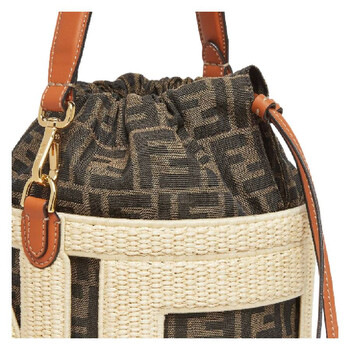 Fendi Ladies Bucket Bag. SKU: 8BT364-APH2-F1LEH. Color: Alchemy/Tabacco Brown/Brandy. Size: 27cm x 20cm x 20cm. Fendi Step Out Straw Bucket Bag. This bucket bag is made of natural-colored straw woven in a moss stitch pattern to create the brand lettering. It features a fixed internal pouch in brown FF motif jacquard fabric, a drawstring closure, and gold-finish metal hardware. The bag can be carried by hand or worn on the shoulder with the detachable brown leather handle and shoulder strap. 52% cotton, 48% polyamide, 100% calfskin, lining:100% polyamide. Made in Italy.