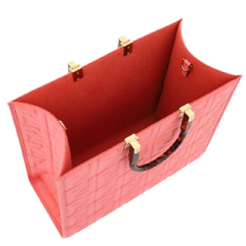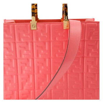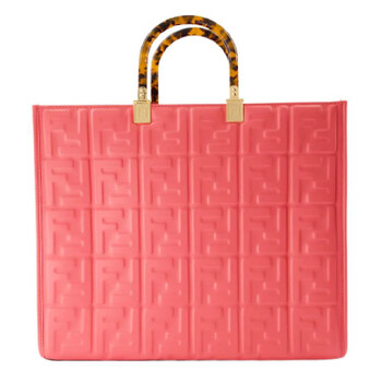 Brand: Fendi. SKU: 8BH386AMCVF1K3C. Color: Pink. Size: 31cm x 35cm x 17cm. Fendi Sunshine Embossed FF Leather Tote Bag. This leather tote bag features an embossed FF motif with a three-dimensional texture and tortoiseshell-effect plexiglass handles adorned with gold-tone metal FF plaques. It includes a detachable shoulder strap, a suede interior, and gold-tone metal hardware. 100% Calfskin, 100% Suede. Made in Italy.