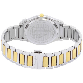 Silver-tone stainless steel case with a two-tone (silver-tone and yellow gold-tone) stainless steel bracelet. Fixed yellow gold-tone stainless steel bezel. Blue dial with yellow gold-tone hands and index hour markers. Dial Type: Analog. Quartz movement. Scratch resistant sapphire crystal. Round case shape, case size: 41 mm, case thickness: 6.9 mm. Fold over clasp with a safety release. Water resistant at 30 meters / 100 feet. Functions: hour, minute. Ferragamo 1898 Slim Series. Luxury watch style. Watch label: Swiss Made. Salvatore Ferragamo Ferragamo 1898 Slim Quartz Blue Dial Men's Watch SFPE00419.