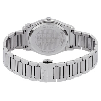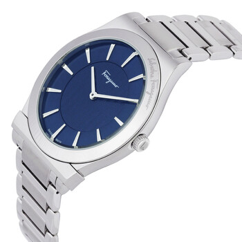 Silver-tone stainless steel case and bracelet. Fixed silver-tone stainless steel bezel. Blue dial with silver-tone hands and index hour markers. Dial Type: Analog. Quartz movement. Scratch resistant sapphire crystal. Round case shape, case size: 41 mm, case thickness: 6.9 mm. Fold over clasp with a safety release. Water resistant at 30 meters / 100 feet. Functions: hour, minute. Ferragamo 1898 Slim Series. Luxury watch style. Watch label: Swiss Made. Salvatore Ferragamo Ferragamo 1898 Slim Quartz Blue Dial Men's Watch SFPE00719.