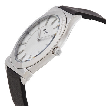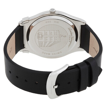 Silver-tone stainless steel case with a black leather strap. Fixed silver-tone stainless steel bezel. Silver-tone dial with silver-tone hands and index hour markers. Dial Type: Analog. Luminescent hands and markers. Quartz movement. Scratch resistant sapphire crystal. Round case shape, case size: 41 mm, case thickness: 6.9 mm. Water resistant at 30 meters / 100 feet. Functions: hour, minute. Ferragamo 1898 Slim Series. Luxury watch style. Watch label: Swiss Made. Salvatore Ferragamo Ferragamo 1898 Slim Quartz Silver Dial Men's Watch SFPE00119.