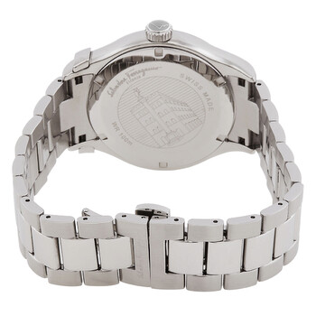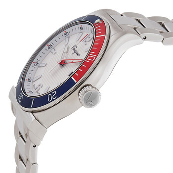 Silver-tone stainless steel case and bracelet. Uni-directional rotating stainless steel bezel with a blue and red (coke) top ring. White dial with silver-tone hands and index-Arabic numeral hour markers. Minute markers around the outer rim. Dial Type: Analog. Luminescent hands and markers. Date display at the 3 o'clock position. Ronda Caliber 715 quartz movement. Scratch resistant sapphire crystal. Pull / push crown. Solid case back. Round case shape, case size: 44 mm, case thickness: 10.5 mm. Band width: 22 mm. Deployment with push button release clasp. Water resistant at 100 meters / 330 feet. Functions: date, hour, minute, second, battery eol indicator. 1898 Sport Series. Sport watch style. Watch label: Swiss Made. Ferragamo 1898 Sport Quartz White Dial Men's Watch SFYK00520.