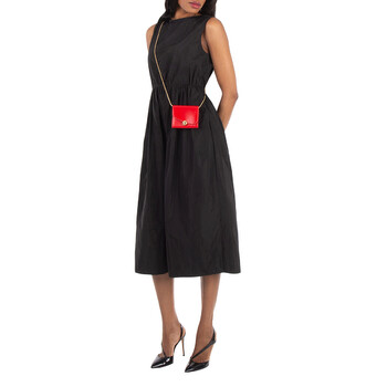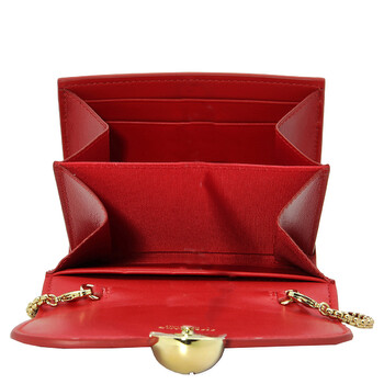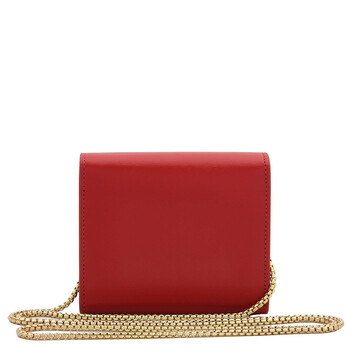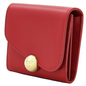 Brand: Ferragamo. SKU: 220551 770697. Color: Red. Ferragamo Asymmetrical Flap Leather Wallet. This wallet features an asymmetrical front flap with a snap button adorned with a personalized boule, double compartments inside with 5 card slots, 2 additional compartments, and a removable metal shoulder strap. 100% calfskin. Made in Italy.