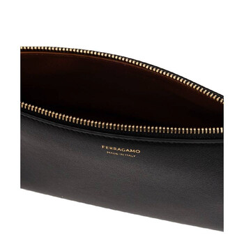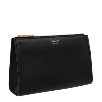 Ferragamo Ladies Cosmetic Case. SKU: 220687 775314. Color: Black. Ferragamo Cosmetic Leather Pouch.This pouch features geometric lines, a golden logo on the front, with a metal zip fastening, a branded pull-tab inside and it offers a spacious interior with contrasting lining. Composition: Calfskin. Made in Italy.