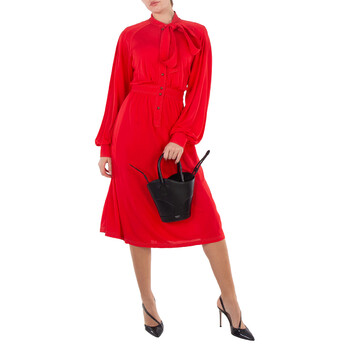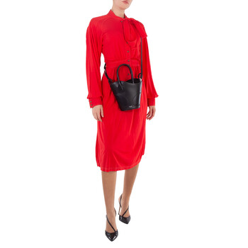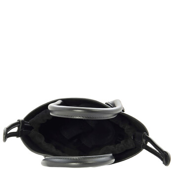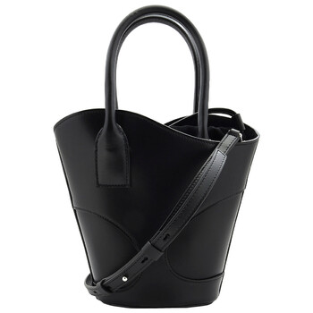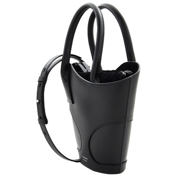 Ferragamo Ladies Bucket Bag. SKU: 215933 768959. Size: H: 11.8" x L: 7.4" x W: 2.5". Ferragamo Cut-Out Detailing Leather Tote Bag. This tote bag has a bucket silhouette with unique details. Made of smooth calfskin, it features a wave-shaped edge, asymmetrical handles, and tonal inlays on the dials. The drawstring and handle in matching suede add texture and a refined feel. It can be carried by hand or over the shoulder using the removable strap. 100% Calfskin. Made in Italy.