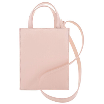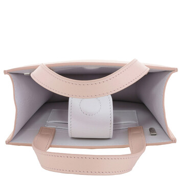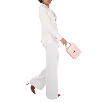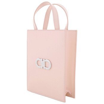 Ferragamo Ladies Tote. SKU: 218358 771813. Barcode: 8056283581301. Color: Pink. Size: H: 7.8" x L: 6.2" x W: 2.5". Ferragamo Double Gancini Mini Leather Tote Bag. This compact tote, crafted from textured Palmellato leather, features a Gancio accent, a bridge and magnet clasp, a short top handle, a contrasting leather-lined interior with card and document slots, and a removable shoulder strap for versatile, hands-free wear. 100% Palmellato Calfskin. Made in Italy.