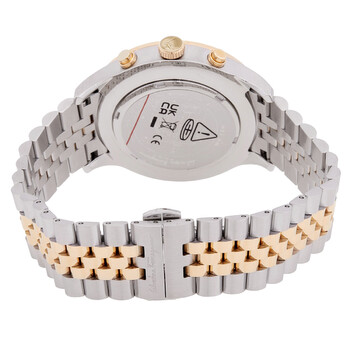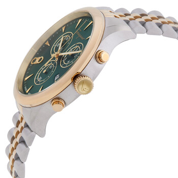 Silver-tone stainless steel case with a two-tone (silver-tone and gold-tone) stainless steel bracelet. Fixed gold-tone stainless steel bezel. Green dial with gold-tone hands and index hour markers. Double-gancio symbol at the 8 o'clock position. Minute markers around the outer rim. Dial Type: Analog. Luminescent hands and markers. Date display at the 4 o'clock position. Chronograph - three sub-dials displaying: 60 second, 30 minute and 1/10th of a second. Quartz movement. Scratch resistant sapphire crystal. Pull / push crown. Solid case back. Round case shape, case size: 43 mm. Butterfly clasp. Water resistant at 50 meters / 165 feet. Functions: chronograph, date, hour, minute, second. Duo Series. Sport watch style. Watch label: Swiss Made. Ferragamo Duo Chronograph Quartz Green Dial Men's Watch SFEZ01224.