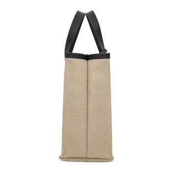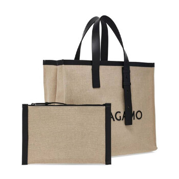 Ferragamo Men's Tote. SKU: 241298 764873. Color: Beige. Ferragamo Embossed Logo Tote Bag. This tote bag features a logo-embossed leather design with calf leather and canvas, an embossed logo on the front, leather trim, a removable pouch, an open top, two adjustable top handles, and a main compartment. Material: Canvas, eco-leather 75%, calf leather 25%. Made in Italy.
