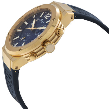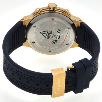 Gold-tone stainless steel case with a blue rubber strap. Fixed gold-tone stainless steel bezel. Blue dial with gold-tone hands and index hour markers. Arabic numeral appears at the 12 o'clock positions. Minute markers around the outer rim. Dial Type: Analog. Luminescent hands and markers. Date display at the 4 o'clock position. Chronograph - three sub-dials displaying: 60 second, 30 minute and 12 hour. Quartz movement. Scratch resistant sapphire crystal. Pull / push crown. Solid case back. Round case shape, case size: 42 mm. Deployment clasp. Water resistant at 50 meters / 165 feet. Functions: chronograph, date, hour, minute, second. F-80 Series. Sport watch style. Watch label: Swiss Made. Ferragamo F-80 Chronograph Quartz Blue Dial Men's Watch SFJE00824.