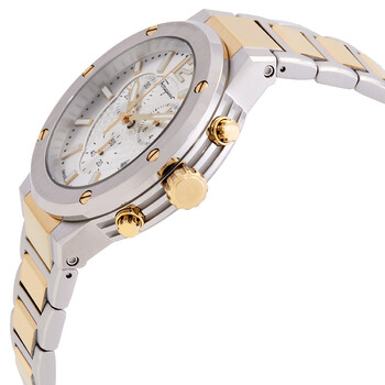 Silver-tone stainless steel case with a two-tone (silver-tone and gold-tone) stainless steel bracelet. Fixed silver-tone stainless steel bezel. White dial with gold-tone hands and index hour markers. Arabic numeral appears at the 12 o'clock positions. Minute markers around the outer rim. Dial Type: Analog. Luminescent hands and markers. Date display at the 4 o'clock position. Chronograph - three sub-dials displaying: 60 second, 30 minute and 12 hour. Quartz movement. Scratch resistant sapphire crystal. Pull / push crown. Solid case back. Round case shape, case size: 42 mm. Deployment clasp. Water resistant at 50 meters / 165 feet. Functions: chronograph, date, hour, minute, second. F-80 Series. Sport watch style. Watch label: Swiss Made. Ferragamo F-80 Chronograph Quartz White Dial Men's Watch SFJE00624.