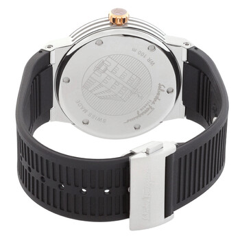 Silver-tone stainless steel case with a black rubber strap. Fixed silver-tone stainless steel bezel. Black dial with gold-tone hands and index-Arabic numeral hour markers. Minute markers around the outer rim. Dial Type: Analog. Date display at the 3 o'clock position. Quartz movement. Scratch resistant sapphire crystal. Pull / push crown. Round case shape, case size: 44 mm, case thickness: 10.3 mm. Band width: 16.5 mm. Deployant clasp. Water resistant at 100 meters / 330 feet. Functions: date, hour, minute, second. F-80 Series. Casual watch style. Watch label: Swiss Made. Salvatore Ferragamo F-80 Quartz Black Dial Men's Watch SFHY00120.
