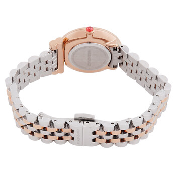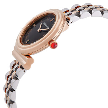 Rose gold-tone stainless steel case with a two-tone (silver-tone and rose gold-tone) stainless steel bracelet. Fixed rose gold-tone stainless steel bezel. Black dial with rose gold-tone hands and Roman numeral hour markers. Dial Type: Analog. Quartz movement. Scratch resistant sapphire crystal. Pull / push crown. Solid case back. Round case shape, case size: 28 mm. Water resistant at 30 meters / 100 feet. Functions: hour, minute. Gancini Series. Dress watch style. Watch label: Swiss Made. Ferragamo Gancini Quartz Black Dial Ladies Watch SFMV01824.