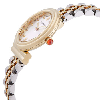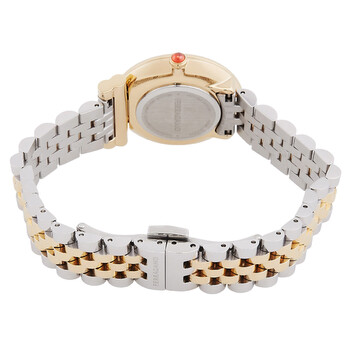 Gold-tone stainless steel case with a two-tone (silver-tone and gold-tone) stainless steel bracelet. Fixed gold-tone stainless steel bezel. Silver dial with gold-tone hands and diamond-index hour markers. Minute markers around the outer rim. Dial Type: Analog. Quartz movement. Scratch resistant sapphire crystal. Pull / push crown. Solid case back. Round case shape, case size: 28 mm. Deployment with push button release clasp. Water resistant at 30 meters / 100 feet. Functions: hour, minute. Gancini Series. Dress watch style. Watch label: Swiss Made. Ferragamo Gancini Quartz Diamond Silver Dial Ladies Watch SFMV01423.