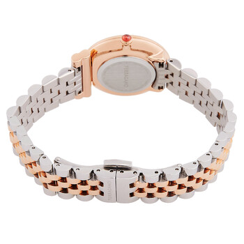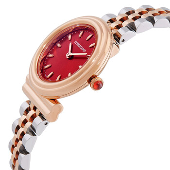 Rose gold-tone stainless steel case with a two-tone (silver-tone and rose gold-tone) stainless steel bracelet. Fixed rose gold-tone stainless steel bezel. Red dial with rose gold-tone hands and index hour markers. Minute markers around the outer rim. Dial Type: Analog. Quartz movement. Scratch resistant sapphire crystal. Pull / push crown. Solid case back. Round case shape, case size: 28 mm. Deployment with push button release clasp. Water resistant at 30 meters / 100 feet. Functions: hour, minute. Gancini Series. Dress watch style. Watch label: Swiss Made. Ferragamo Gancini Quartz Red Dial Two-Tone Ladies Watch SFMV01323.