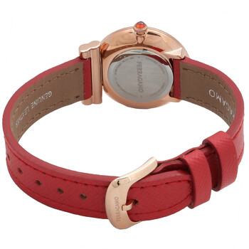 Rose gold-tone stainless steel case with a red leather strap. Fixed rose gold-tone stainless steel bezel. Silver dial with rose gold-tone hands and index hour markers. Minute markers around the outer rim. Dial Type: Analog. Quartz movement. Scratch resistant sapphire crystal. Pull / push crown. Solid case back. Round case shape, case size: 28 mm. Buckle clasp. Water resistant at 30 meters / 100 feet. Functions: hour, minute. Gancini Series. Casual watch style. Watch label: Swiss Made. Ferragamo Gancini Quartz Silver Dial Ladies Watch SFMV01123.