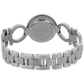 Silver-tone stainless steel case and bracelet. Fixed silver-tone stainless steel bezel. Light blue dial with silver-tone hands and index hour markers. Dial Type: Analog. Quartz movement. Scratch resistant sapphire crystal. Pull / push crown. Solid case back. Round case shape, case size: 28 mm. Jewelry clasp. Water resistant at 30 meters / 100 feet. Functions: hour, minute. Gancino Series. Dress watch style. Watch label: Swiss Made. Ferragamo Gancino Quartz Ladies Watch SFYA01524.