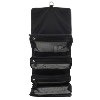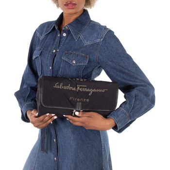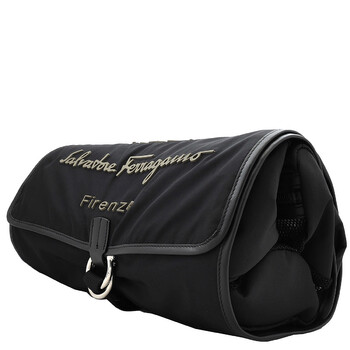 Ferragamo Ladies Luggage. SKU: 212921 757235. Barcode: 8057553938979. Color: Black. Ferragamo Ladies Black Nomadic Travel Shoe Case. Crafted from super-soft 100% recycled nylon, this shoe case features four separate zip compartments, a front mesh insert, and a roll-up design for easy storage. Use the handle to attach it to your hand luggage or carry it by hand. The rubberized 3D signature on the front adds the perfect Ferragamo finishing touch.