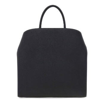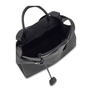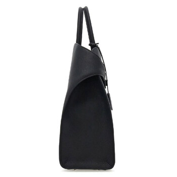 Ferragamo Men's Tote. SKU: 241666 777378. Color: Black. Ferragamo Leather Hug Tote Bag. This bag features an asymmetrical back panel that wraps around to 'hug' the front, secured by two wide leather straps with custom Gancini clasps. The lined interior includes a zip pocket, and a tonal leather fob is attached to the rigid top handle. composition: calfskin. Made in Italy.