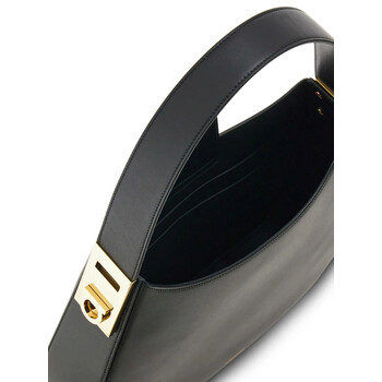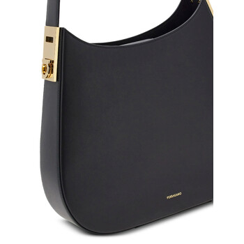 Ferragamo Ladies Hobo. SKU: 214444 764359. Color: Black. Size: H: 13.3" x L: 10.6" x W: 2.7". Ferragamo Medium Leather Hobo Bag. The new Ferragamo Hobo bag showcases a geometric shape, an adjustable handle with Gancini buckles on the sides, and a suede-lined interior featuring a large flat pocket, two card slots, and an inner bridge fastening. Material: 100% Calfskin.