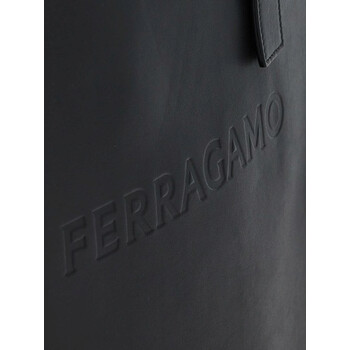 Ferragamo Men's Briefcase. SKU: 241435 769591. Color: Black. Size: H:39. 0cm, L:37. 0cm, W: 9. 0cm. Ferragamo Men's Tote. Features a matte finish and is embellished with a logo engraved on the front. It has a geometric and pure design, with a suede inner lining and a large zippered pocket for organizing personal items. The side bellows can expand the bag's capacity, and the asymmetrical design handles are adjustable for customized styling. 100% Calfskin . Made in Italy.