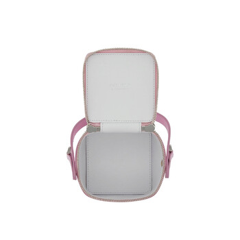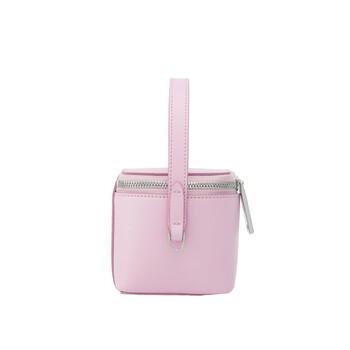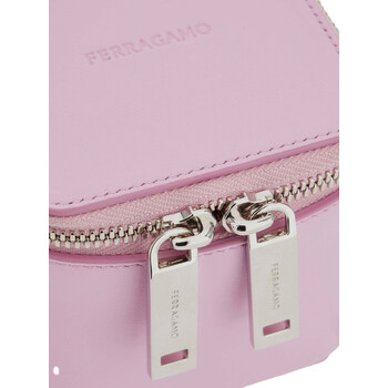 Ferragamo Ladies Handbag. SKU: 220481 763886. Color: Pink. Ferragamo Micro Handbag. This micro handbag features a geometric design with a wrap-around double zipper and a lined interior. It can be carried by the top handle or worn crossbody using the removable strap with custom clips. 100% calfskin. Made In Italy.
