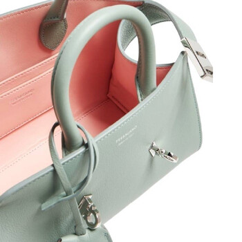Brand: Ferragamo. SKU: 215975 772010. Size: H:5.5"x L:8.8"x W:4.3". Ferragamo Mini Bicolor Handbag.This handbag features a logo stamp on the front, a Gancini flip-lock fastening, a logo tag, two rolled top handles, a concealed magnetic fastening, an adjustable detachable shoulder strap, a main compartment, and internal card slots. 100% Calfskin. Made in Italy.