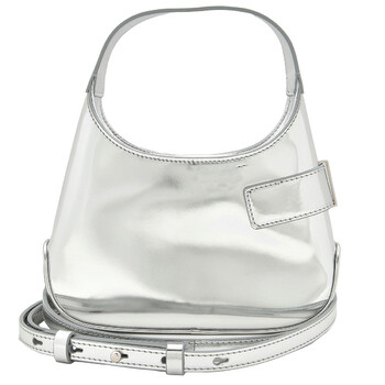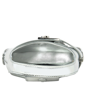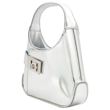 Ferragamo Ladies Mini Bag. SKU: 215943 769141. Color: Grey. Ferragamo Mini Metallic Arch Shoulder Bag.This shoulder bag features a rounded base,a geometric front pocket that secures with a strap and Gancio buckle. The bridge and magnet opening reveal a lined interior with a flat pocket. It can be carried by hand or across the body using the removable shoulder strap. Material: Laminated Calkskin. Made in Italy.