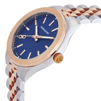 Silver-tone stainless steel case with a two-tone (silver-tone and rose gold-tone) stainless steel bracelet. Fixed rose gold-tone stainless steel bezel. Blue dial with rose gold-tone hands and index hour markers. Double gancini at the 8 o'clock position. Minute markers around the outer rim. Dial Type: Analog. Quartz movement. Scratch resistant sapphire crystal. Pull / push crown. Solid case back. Round case shape, case size: 38 mm. Deployment clasp. Water resistant at 50 meters / 165 feet. Functions: hour, minute, second. New Lady Series. Dress watch style. Watch label: Swiss Made. Ferragamo New Lady Quartz Blue Dial Two-Tone Watch SFU100223.