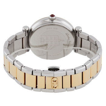 Gold-tone stainless steel case with a two-tone (silver-tone and gold-tone) stainless steel bracelet. Fixed gold-tone stainless steel bezel. Silver dial with silver-tone hands and index-Roman numeral hour markers. Dial Type: Analog. Luminescent hands and markers. Date display at the 3 o'clock position. Quartz movement. Scratch resistant sapphire crystal. Pull / push crown. Solid case back. Round case shape, case size: 40 mm, case thickness: 8.9 mm. Band width: 20 mm. Deployment clasp. Water resistant at 50 meters / 165 feet. Functions: date, hour, minute, second. Ora Series. Casual watch style. Watch label: Swiss Made. Ferragamo Ora Quartz Silver Dial Ladies Watch SFUB00421.