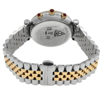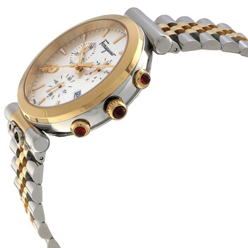 Silver-tone stainless steel case with a two-tone (silver-tone and gold-tone) stainless steel bracelet. Fixed gold-tone stainless steel bezel. White dial with gold-tone hands and index hour markers. Minute markers around the outer rim. Dial Type: Analog. Luminescent hands and markers. Date display at the 4 o'clock position. Quartz movement. Scratch resistant sapphire crystal. Pull / push crown. Solid case back. Round case shape, case size: 40 mm. Water resistant at 50 meters / 165 feet. Functions: date, hour, minute, second. Ora Series. Sport watch style. Watch label: Swiss Made. Ferragamo Ora Quartz White Dial Watch SFYB02324.