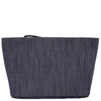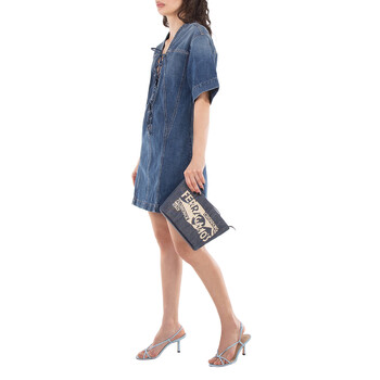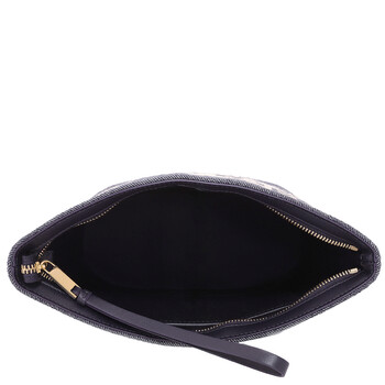 Ferragamo Ladies Pouch. SKU: 220688 773824. Barcode: 8056283746984. Color: Blue. Size: Height 6.6 IN x Length 8.6 IN x Width 4.3 IN. Ferragamo Pouch With Logo. Compact and versatile, this toiletry bag is crafted from woven raffia with macro-embroidery on the front, featuring the Venna logo—a motif designed by the artist of the same name, which debuted on the Vara shoes in the 1930s. It has a zip fastening, a long leather wristlet, and a lined interior with a flat pocket for added organization. Composition: raffia and calfskin.