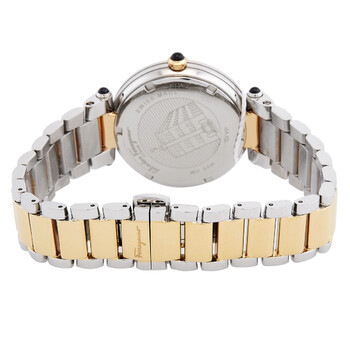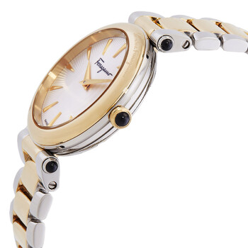 Gold-tone stainless steel case with a two-tone (silver-tone and gold-tone) stainless steel bracelet. Fixed gold-tone stainless steel bezel. Silver dial with gold-tone hands and index hour markers. Dial Type: Analog. Quartz movement. Scratch resistant sapphire crystal. Pull / push crown. Solid case back. Round case shape, case size: 36 mm, case thickness: 9.35 mm. Band width: 15 mm. Deployment clasp. Water resistant at 50 meters / 165 feet. Functions: hour, minute. Dress watch style. Watch label: Swiss Made. Ferragamo Quartz Silver Dial Ladies Watch SFYP00520.