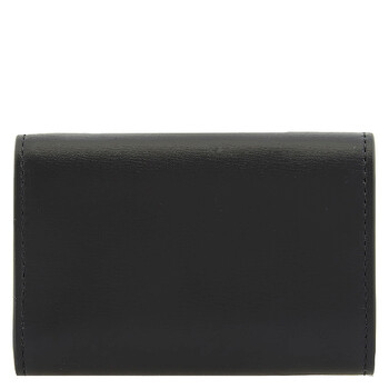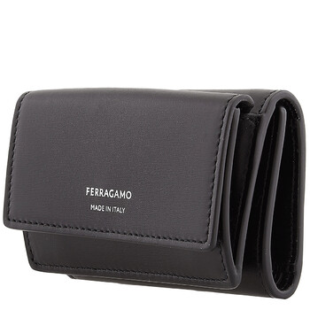 Ferragamo Men's Card Case. SKU: 661337 770115. Color: Black. Size: H 6.5 x L 9.5 cm. Ferragamo Tri-Fold Leather Card Holder. This card case, crafted from 100% palellato calfskin, features an external pocket and a spacious central compartment. The front is adorned with a logo finished in palladium tones. 100% Leather. Made in Italy