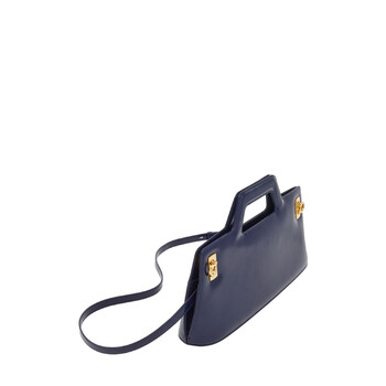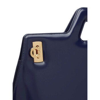 Ferragamo Ladies Top Handle Bag. SKU: 213484 766579. Material: Calfskin. Color: Blue. Size: L:37cm x H:20cm x D:9cm. Wanda East West Calfskin Tote. This tote features two decorative Gancini logo closures, two handles, a detachable and adjustable shoulder strap, silver-tone metal hardware, and one internal compartment with a slip pocket. 100% Calfskin. Made in Italy.