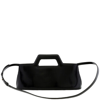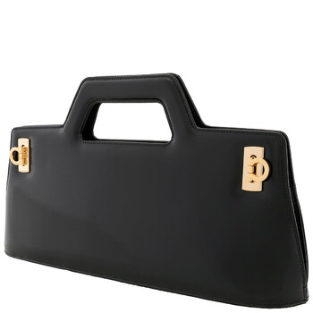Ferragamo Ladies Top Handle Bag. SKU: 213484 760351. Color: Black. Size: H: 7.8" x L: 14.5" x W: 3.5". Ferragamo Wanda East-West Top Handle Bag. This avant-garde geometric handbag, inspired by the iconic Wanda style, is crafted from brushed calfskin. It features a lined interior with two flat pockets and can be carried as a handbag or shoulder bag with the detachable strap. The side fastening has a satin-finish steel Gancini accent. 100% Calfskin. Made in Italy.