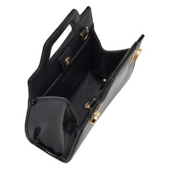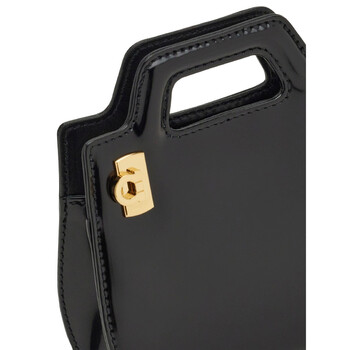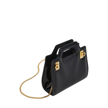 Ferragamo Ladies Mini Bag. SKU: 213984 762512. Material: Calfskin. Color: Black. Size: W:13cm x H:13cm x D:4cm. Ferragamo Wanda Micro Leather Shoulder Bag. This shoulder bag, crafted from smooth calfskin, features geometric shapes and rigid panels, with a double Gancini buckle on the side and a detachable strap. 100% calfskin. Made in Italy.