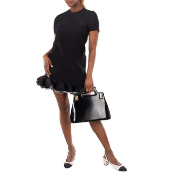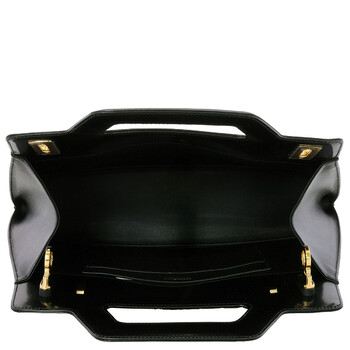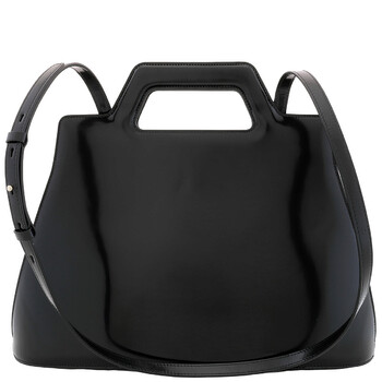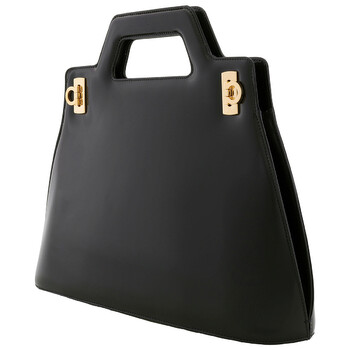 Ferragamo Ladies Top Handle Bag. SKU: 213961 761287. Color: Black. Size: H: 11.4" x L: 13.7" x W: 3.9". Ferragamo Wanda Top Handle Bag. This handbag features a flared design and is crafted from brushed calfskin. It has a Gancini snap buckle closure and a leather interior with two patch pockets. The bag includes a laminated Ferragamo logo, a flat brushed leather shoulder strap that is adjustable and removable, and double rigid handles. Material: Brushed Calfskin. Made in Italy.