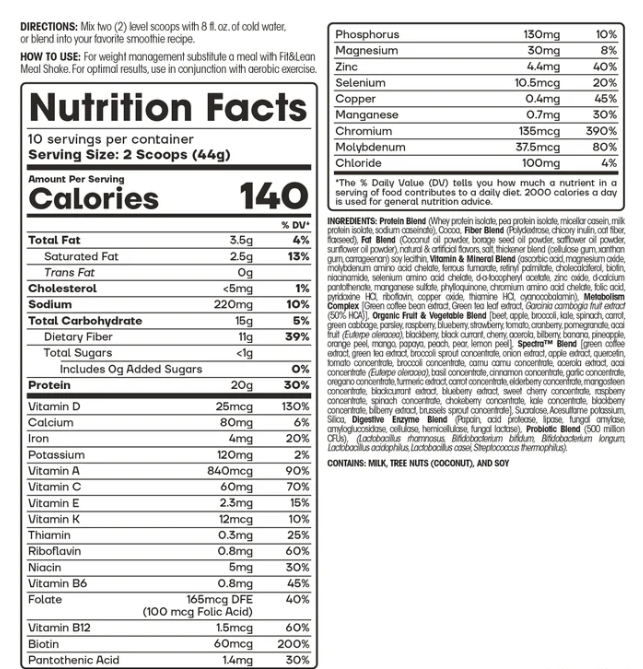 Fit&Lean Meal Shake არის დაბალკალორიული, ნუტრიენტებით გამდიდრებული შეიკი, რომელიც შექმნილია ჯანსაღი წონის კონტროლისა და ენერგიის გასაუმჯობესებლად. ეს გემრიელი შეიკი შეიცავს მაღალი ხარისხის ცილებს, ბოჭკოებს, ვიტამინებსა და მინერალებს, რაც უზრუნველყოფს დანაყრების შეგრძნებას და ორგანიზმის ოპტიმალურ მუშაობას მთელი დღის განმავლობაში.