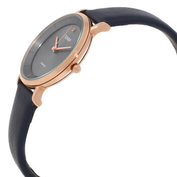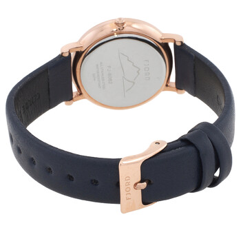 Rose gold-tone stainless steel case with a blue leather strap. Fixed rose gold-tone stainless steel bezel. Grey dial with rose gold-tone hands and index hour markers. Dial Type: Analog. Quartz movement. Round case shape, case size: 32 mm. Functions: hour, minute, second. Jensen Series. Dress watch style. Fjord Jensen Grey Dial Ladies Watch FJ-6062-05.