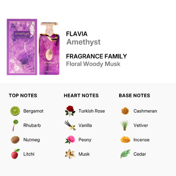 At first spray, Flavia Amethyst opens with a refreshing burst of bergamot and rhubarb, gently spiced with nutmeg and sweetened by juicy litchi. As the scent evolves, a heart of lush Turkish rose, soft vanilla, delicate peony, and warm musk creates a graceful floral core that feels both comforting and refined. Finally, the depth of cashmeran, earthy vetiver, smoky incense, and rich cedar leaves a lasting impression that is smooth, bold, and unforgettable.