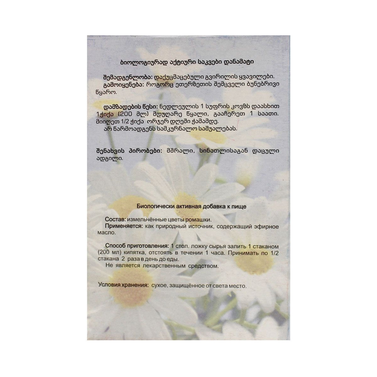 1,5გ გვირილას ყვავილები დაფასოებულია ერთჯერადი გამოყენების ფილტრ-პაკეტებში. #20 ფილტრ-პაკეტი მოთავსებულია მუყაოს კოლოფში.