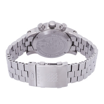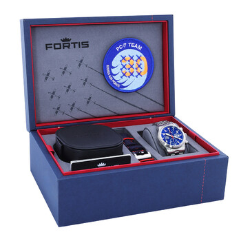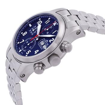 Silver-tone stainless steel case and bracelet. Fixed silver-tone stainless steel bezel. Blue dial with silver-tone hands and Arabic numeral & index hour markers. Minute markers around the outer rim. Dial Type: Analog. Luminescent hands and markers. Day of the week and date display at the 3 o'clock position. Chronograph - three sub-dials displaying: 60 second, 30 minute and 12 hour. ETA-Valjoux Caliber 7750 Automatic movement, containing 25 Jewels, bitting at 28800 vph, and has a power reserve of approximately 44 hours. Scratch resistant sapphire crystal. Pull / push crown. Solid case back. Round case shape, case size: 42 mm, case thickness: 15 mm. Band width: 20 mm, band length: 8 inches. Deployment with push button release clasp. Water resistant at 200 meters / 660 feet. Functions: chronograph, date, day, hour, minute, second. Additional Info: hours, minutes, small seconds, day-date, chronograph limited edition of 300 pieces - special box set with extra fabric strap. Aeromaster Series. Luxury watch style. Watch label: Swiss Made. Fortis Aeromaster Chronograph Automatic Blue Dial Men's Watch F4040004.