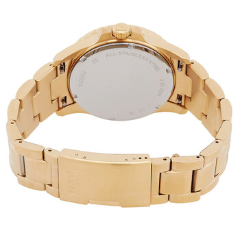 Gold-tone stainless steel case and bracelet. Black stainless steel bezel. Black dial with gold-tone hands and dots hour markers. Minute markers around the outer rim. Dial Type: Analog. Luminescent hands and markers. Date display at the 3 o'clock position. Quartz movement. Scratch resistant mineral crystal. Solid case back. Round case shape, case size: 42 mm, case thickness: 12 mm. Band width: 22 mm. Fold over clasp with a safety release. Water resistant at 100 meters / 330 feet. Functions: date, hour, minute, second. Blue Dive Series. Dress watch style. Watch label: Japan Movt. Fossil Blue Dive Quartz Black Dial Men's Watch FS6035.