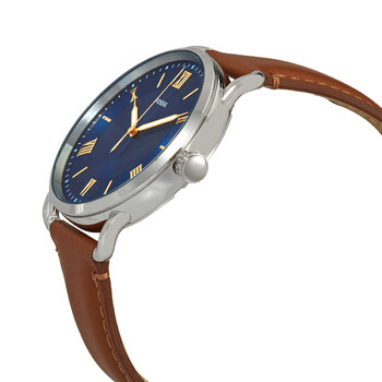 Stainless steel case with a brown luggage leather strap. Fixed stainless steel bezel. Blue dial with luminous gold-tone hands and alternating index and Roman numeral hour markers. Minute markers around the outer rim. Dial Type: Analog. Luminescent hands. Quartz movement. Scratch resistant mineral crystal. Pull / push crown. Solid case back. Round case shape. Case size: 42 mm. Case thickness: 9 mm. Band width: 22 mm. Tang clasp. Water resistant at 50 meters / 165 feet. Functions: hour, minute, second. Copeland Series. Casual watch style. Watch label: Japan Movt. Fossil Copeland Quartz Blue Dial Men's Watch FS5661.