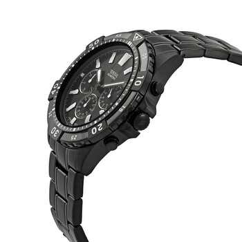 Black-plated stainless steel case and bracelet. Uni-directional rotating black-plated bezel. Black dial with luminous black hands and index hour markers. Minute markers around the outer rim. Dial Type: Analog. Luminescent hands and markers. Chronograph - three sub-dials displaying: 60 second, 30 minute and 24 hours. Quartz movement. Scratch resistant mineral crystal. Solid case back. Round case shape. Case size: 44 mm. Case thickness: 12 mm. Band width: 20 mm. Fold over clasp with a push button release. Water resistant at 100 meters / 330 feet. Functions: chronograph, date, hour, minute, second. Garrett Series. Dress watch style. Watch label: Japan Movt. Fossil Garrett Chronograph Quartz Black Dial Men's Watch FS5773.