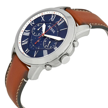 Stainless steel case with a light brown leather strap. Fixed stainless steel bezel. Navy blue dial with luminous silver-tone hands and Roman numeral hour markers. Minute markers around the outer rim. Dial Type: Analog. Luminescent hands. Chronograph - three sub-dials displaying: 60 second, 30 minute and 24 hours. Quartz movement. Scratch resistant mineral crystal. Pull / push crown. Solid case back. Case size: 44 mm. Case thickness: 12 mm. Round case shape. Band width: 22 mm. Tang clasp. Water resistant at 50 meters / 165 feet. Functions: chronograph, hour, minute, second. Casual watch style. Fossil Grant Chronograph Navy Blue Dial Men's Watch FS5210.