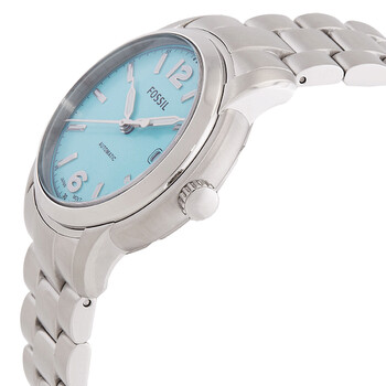 Silver-tone stainless steel case and bracelet. Fixed silver-tone stainless steel bezel. Blue dial with silver-tone hands and index-Arabic numeral hour markers. Minute markers around the outer rim. Dial Type: Analog. Date display at the 3 o'clock position. Automatic movement. Scratch resistant mineral crystal. Pull / push crown. Transparent see through case back. Round case shape, case size: 38 mm. Band width: 20 mm. Double press deployant clasp. Water resistant at 50 meters / 165 feet. Functions: date, hour, minute, second. Heritage Series. Casual watch style. Watch label: Japan Movt. Fossil Heritage Automatic Blue Dial Ladies Watch ME3245.