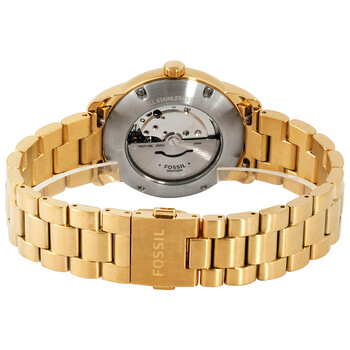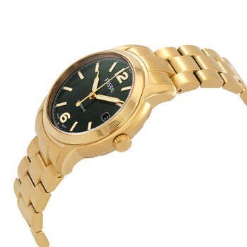 Gold-tone stainless steel case and bracelet. Fixed gold-tone stainless steel bezel. Green dial with gold-tone hands and Arabic numeral and indicies hour markers. Minute markers around the outer rim. Dial Type: Analog. Luminescent hands and markers. Date display at the 3 o'clock position. Quartz movement. Scratch resistant sapphire crystal. Pull / push crown. Transparent see through case back. Round case shape, case size: 38 mm. Band width: 20 mm. Deployment with push button release clasp. Water resistant at 50 meters / 165 feet. Functions: date, hour, minute, second. Heritage Series. Watch label: Japan Movt. Fossil Heritage Quartz Green Dial Ladies Watch ME3235.